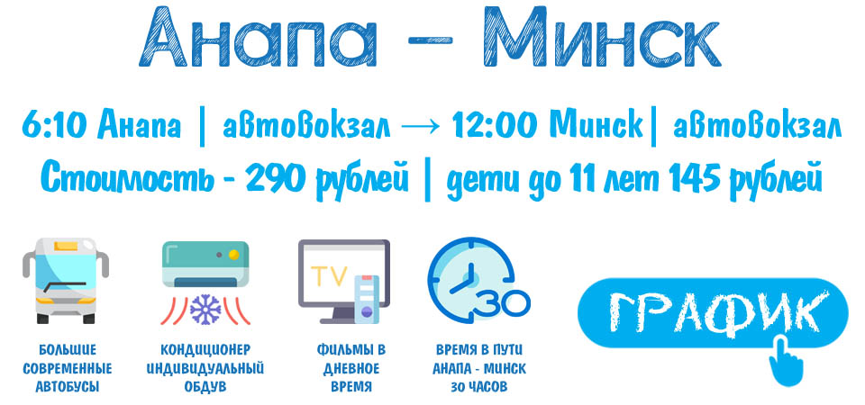 Автобус Минск – Анапа оборудован следующими дополнительными услугами: телевизор, бесплатный WiFi, кондиционер. Данные услуги могут частично отсутствовать на некоторых автобусах. Уточняйте наличие у оператора.